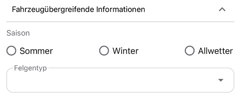 Hier können bestimmte Informationen eingegeben werden, die für alle vier Reifen gelten, zum Beispiel die Saison und der Felgentyp.