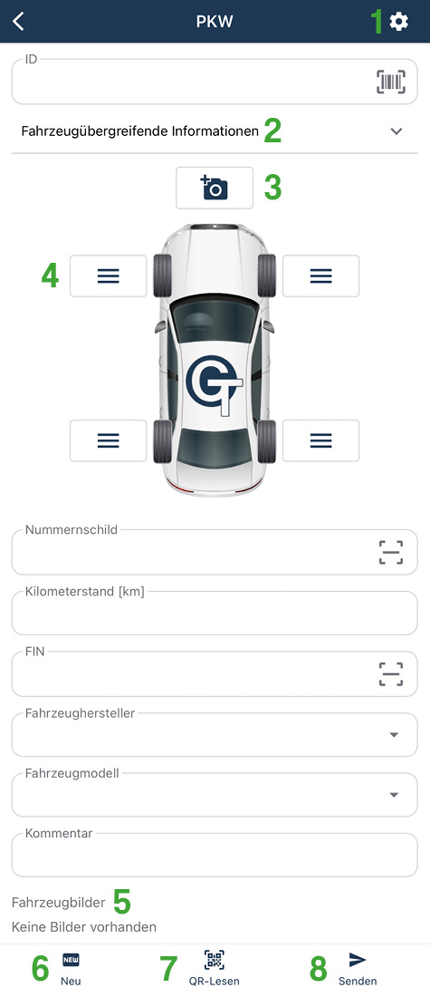 Geben Sie hier das Nummernschild / die FIN ein. Tippen Sie alternativ auf das Scanner-Symbol [–] um das Nummernschild / die FIN mit der Kamera automatisch zu erfassen.