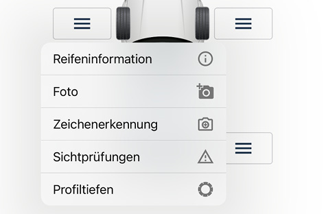 Tippen Sie auf das Kamera-Symbol, um direkt zu den aufgenommenen Bildern innerhalb des Bereichs „Reifeninformation“ zu gelangen.