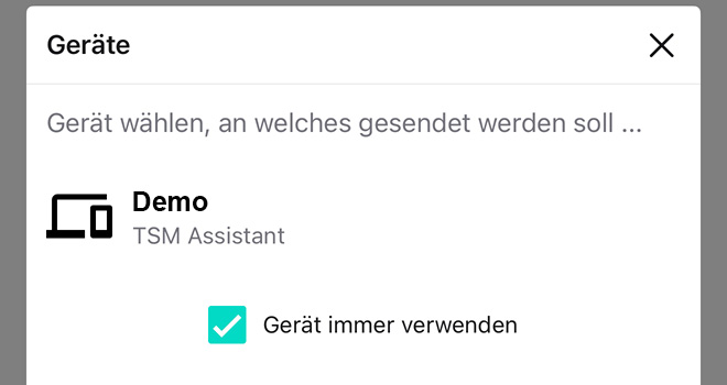 Nach dem Tippen auf den Button „Senden“ erscheint eine Auflistung der verfügbaren Geräte, an die das Projekt gesendet werden kann. Achtung: Es können nur Geräte angezeigt werden, die sich im gleichen Netzwerk befinden.