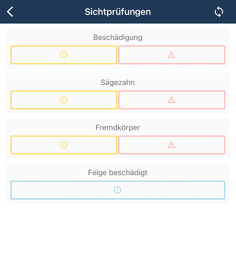 Tippen Sie bei allen zutreffenden Merkmalen auf einen der Buttons, um den jeweiligen Zustand zu dokumentieren. Das Ergebnis der Sichtprüfung wird unter Anderem im PDF-Protokoll angezeigt.