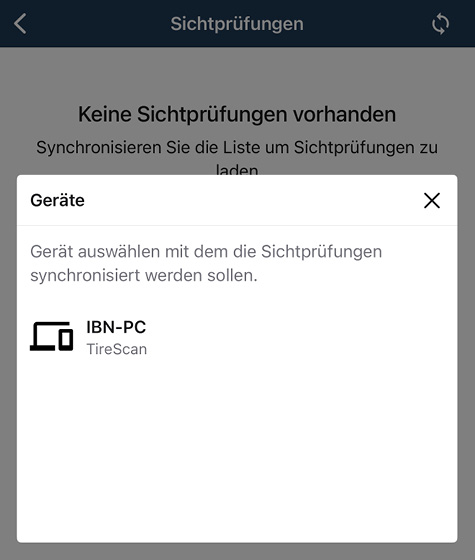 Stellen Sie sicher, dass das Smartphone im gleichen Netzwerk verbunden ist wie das Hilfsprogramm Tire Scan Assistant oder wie ein Reifenprofil-Messgerät von GL Technology. Tippen Sie auf „SYNCHRONISIEREN“.