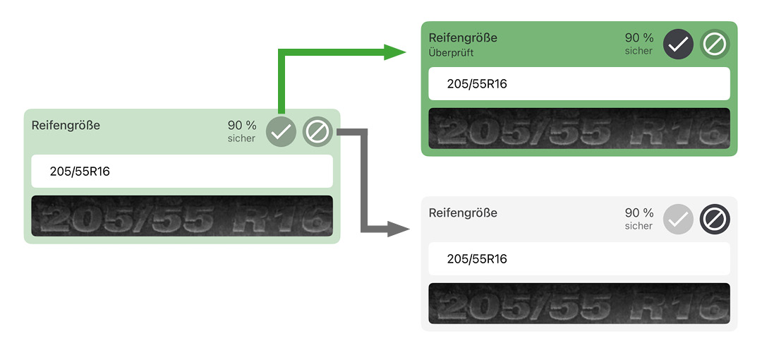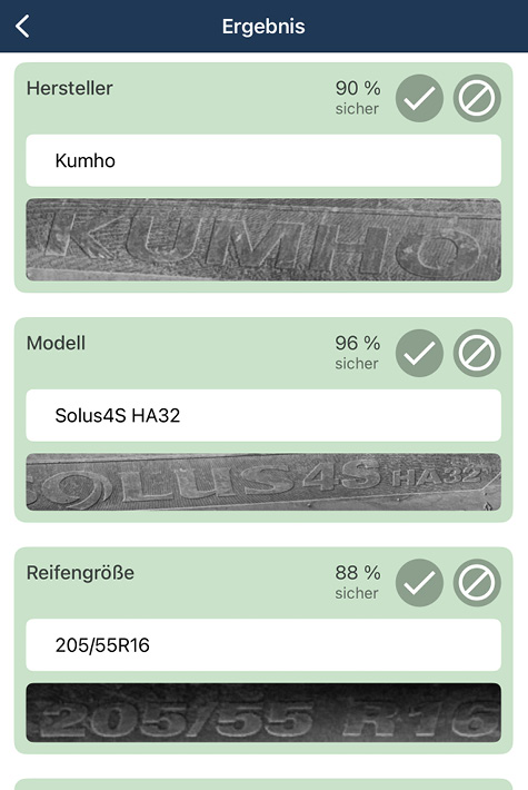 Ein Reifenfoto wird auf Basis maschinellen Lernens analysiert und die erkannten Reifendaten werden dem Projekt automatisch als Reifeninformationen hinzugefügt (das heißt die Eingabefelder werden nicht händisch, sondern von der KI ausgefüllt). Sie können die Ergebnisse überprüfen oder sofort übernehmen.