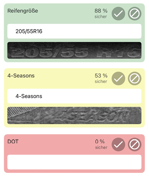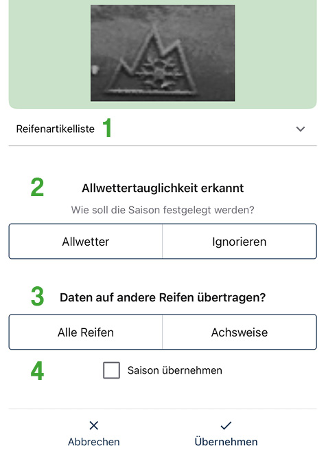 (4) Weitere Checkboxen (abhängig von der Art des erkannten Reifens):