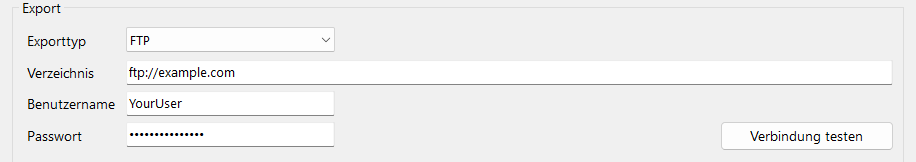 Geben Sie die FTP-Zugangsdaten und das Passwort ein und überprüfen Sie die Verbindung mit dem Button „Verbindung testen“.