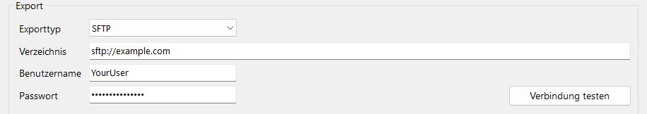 Geben Sie die SFTP-Zugangsdaten und das Passwort ein und überprüfen Sie die Verbindung mit dem Button „Verbindung testen“.