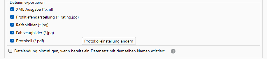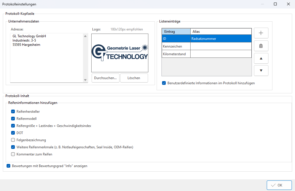 Gibt an, welche Reifeninformationen auf dem PDF-Protokoll angedruckt werden sollen.