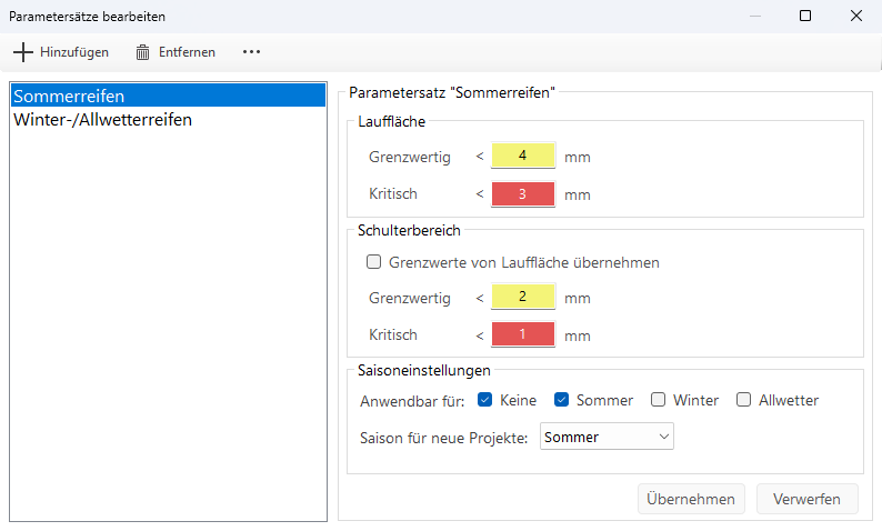 Öffnet ein Fenster, in dem Sie die Reifenparameter bearbeiten können. Sie können z.B. die farbliche Kennzeichnung der Profiltiefen (grenzwertig = gelb; kritisch = rot) anpassen bzw. Sie können die Grenzbereiche individuell definieren. Außerdem können Sie weitere Reifentypen anlegen, sofern benötigt. Voreingestellt sind Sommerreifen sowie Winter-/Allwetterreifen.