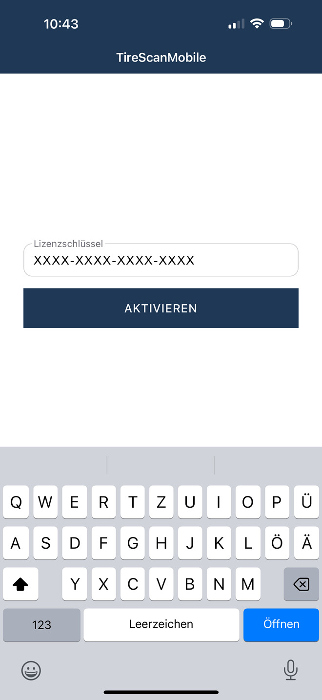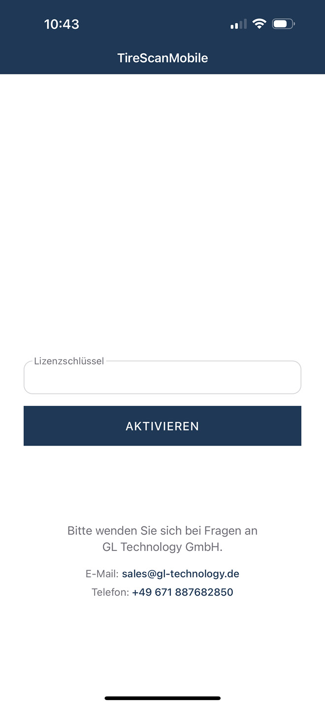 Sofern Sie einen gültigen Lizenz-Code eingegeben haben, sehen Sie den Startbildschirm von Tire Scan Mobile.